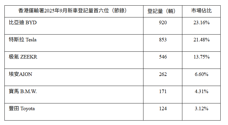 香港運輸署2025年9月新車登記量首六位(節錄)
