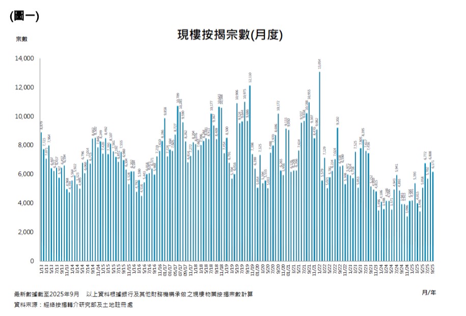 根據經絡按揭轉介研究部及土地註冊處最新資料顯示,2025年九月份現樓按揭宗數為6,171宗,較八月份的6,808宗減少637宗(9.4%);而該月的樓花按揭宗數為1,070宗,較八月份的379宗大增691宗(182.3%),創逾5年半(68個月)新高。對比去年同期,2025年九月份現樓按揭宗數比2024年同期3,943宗增加2,228宗(56.5%);樓花按揭宗數比2024年同期568宗增加502宗(88.4%)。