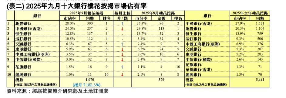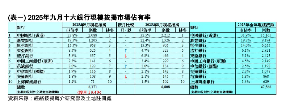 2025年九月份四大銀行現樓市佔率由上月75%微跌0.3%至74.7%。曹表示,息口回落,銀行對按揭業務取態轉趨正面,為爭取按揭業務而推出不同按揭計劃及優惠,當中包括滙豐銀行新推出的首三年及五年定息按揭計劃,其息率比一般銀行的浮息按揭計劃低,相信將會吸引到部分新造按揭客戶以及轉按業主選用,料大型銀行按揭選用比例或會保持高水平。