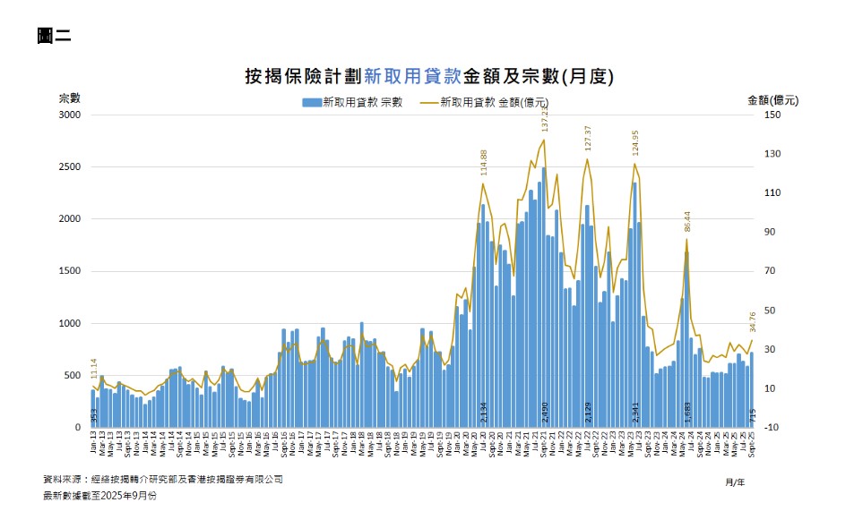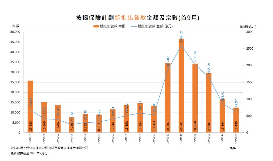 以首9個月比較,2025年首9個月新批出按保貸款宗數及金額為12,490宗及623.37億元,比去年同期的16,604宗及866.41億元,下跌4,114宗(24.8%)及243.04億元(28.1%),宗數創近9年首9個月新低,金額創近6年首9個月新低。而今年首9個月新取用按保貸款宗數及金額為5,411宗及267.47億元,比去年同期的7,851宗及404.21億元,減少2,440宗(31.1%)及136.74億元(33.8%),宗數創近9年首9個月新低,金額創近6年首9個月新低。