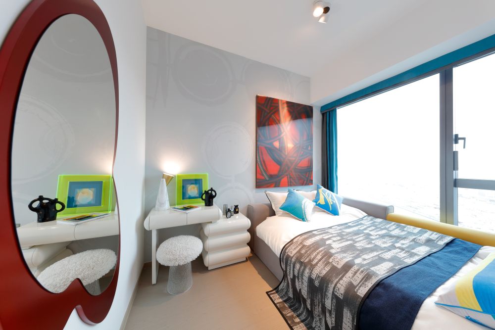主人房貫徹單位設計風格,以簡約線條勾勒出優雅的美感,配紅色曲線牆身鏡作點綴。睡房擺放標準雙人床,床頭放置白色烤漆可伸縮梳妝台兼床頭櫃,自由組合,高效利用空間,以柔和的線條勾勒出簡約的美感,從每一個細節顯示出簡約而不簡單的魅力,展現藝術與功能的完美結合。