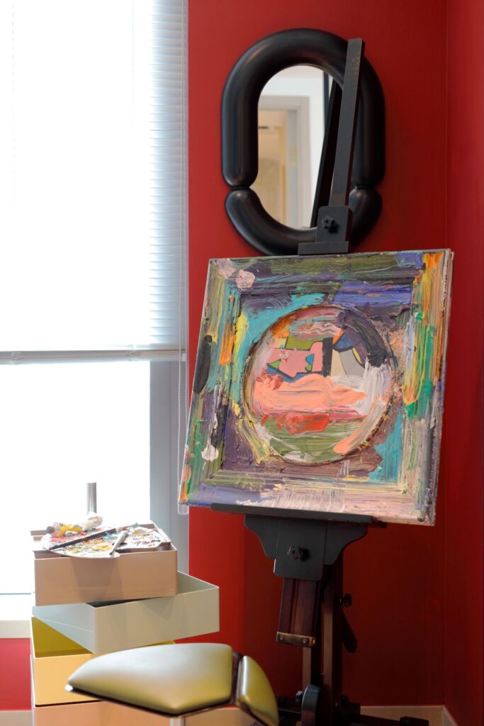 其中一個房間設計成繪畫室,提供創作和休憩的空間,同時為空間增添一份亮眼的角落。全屋的定制設計,成創造專屬空間,旨在讓每一位居住者,能在這裡找到屬於⾃⼰的藝術語⾔。單位內的原創藝術牆紙、抽象畫作、復古留聲機等細節,如同一幅精心構思的畫卷,用藝術的筆觸勾勒出生活的美好與和諧。